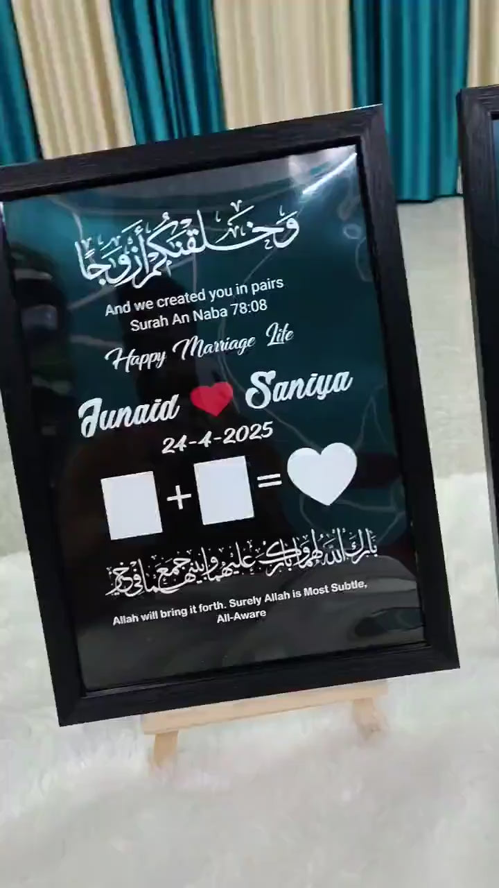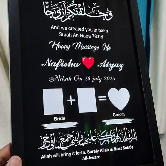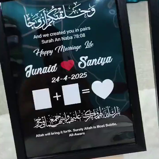 Celebrate forever with this elegant Nikah frame featuring your names, date & a heartfelt Quranic verse. Perfect for weddings, gifts & keepsake memories.