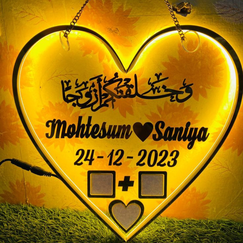 Stylish heart thumb board with warm white LED lights & adapter. Gold acrylic finish, personalized with names & date, space for thumb impressions — perfect Nikah or wedding memory.