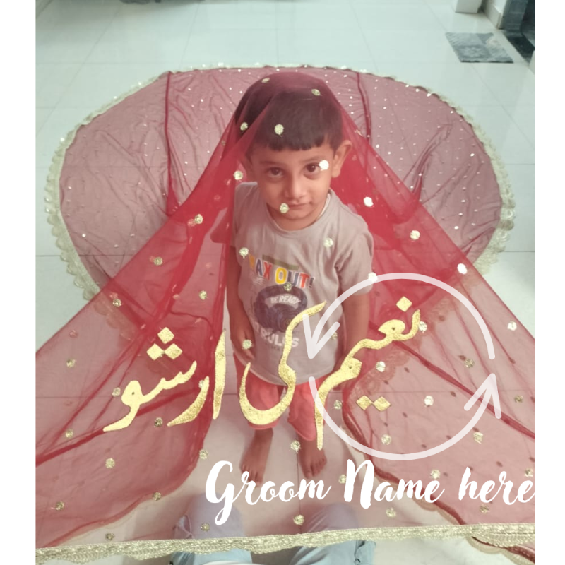 Elegant long tail dupatta with personalized machine embroidery like “Amir ki Dulhan”, perfect for Nikah and bridal events. Designed with neat machine work (not hand embroidery) and finished with a beautiful border on all four sides.